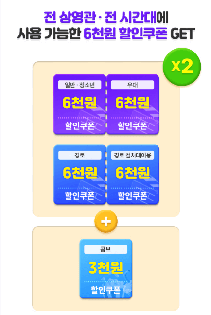 예: 7,000원 관람료 – 6,000원 할인권 = 실제 결제 금액 1,000원! - 조조, 청소년, 장애인, 경로 우대 할인과 중복 가능