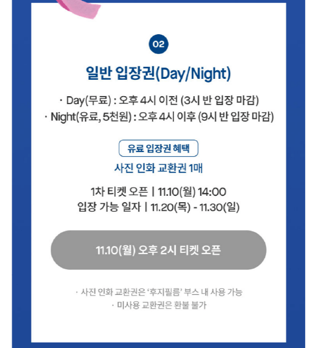 • 저녁(나이트권): 16:00~22:00 5,000원 (입장 시 사진 인화 교환권 1매 포함)