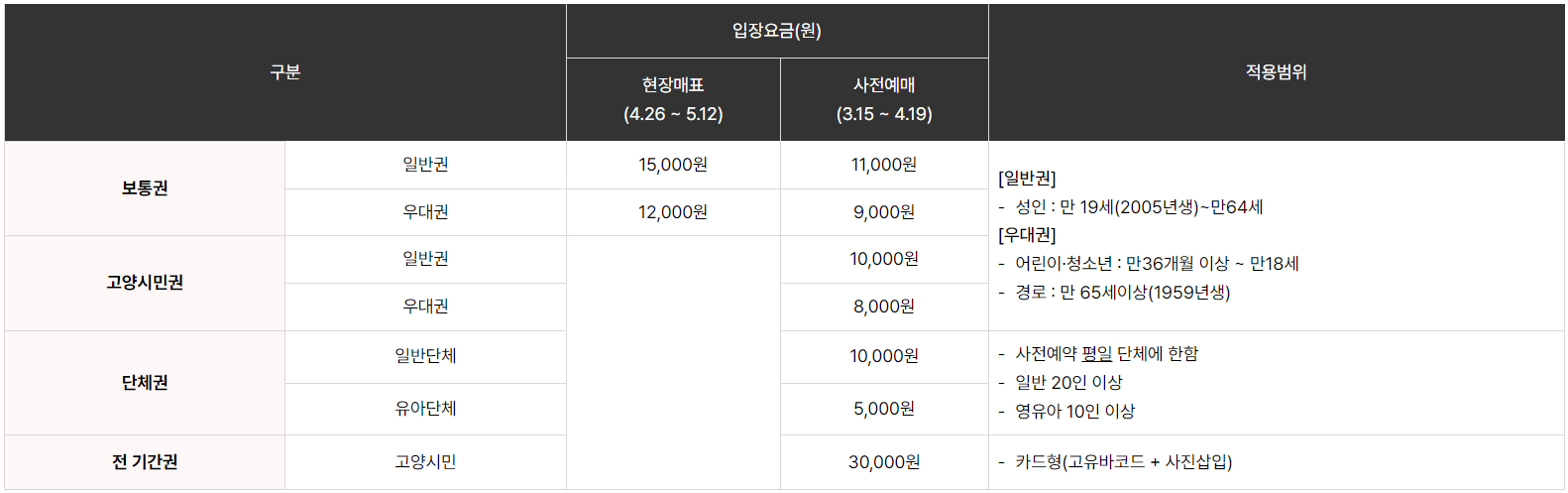 고양 시민의 경우 3,000원 지역 할인 혜택을 받으실 수 있으며 일반 20인 이상, 영유아 10인 이상의 단체권과 행사가 진행되는 전 기간 자유롭게 관람 가능한 전 기간권은 추가 할인된 가격으로 구매가 가능합니다.