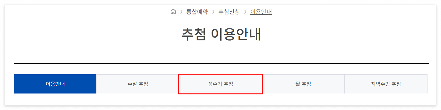 2. 로그인 → 통합예약 → 추첨 신청 → 추첨 이용 안내 → 성수기 추첨 클릭