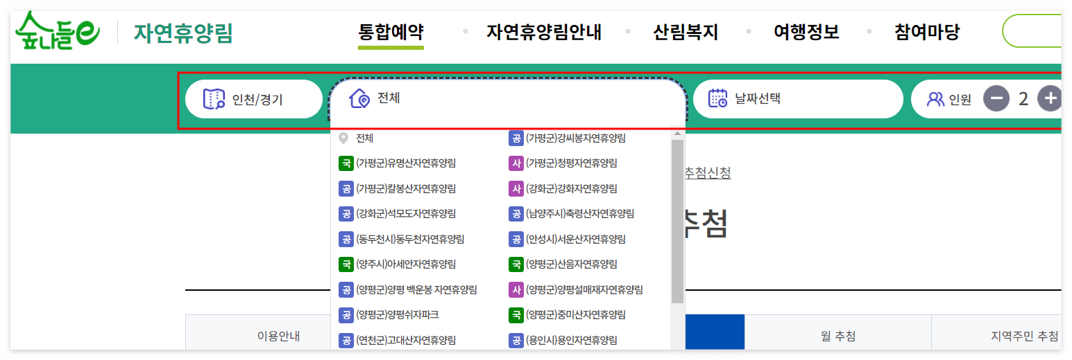 3. 지역, 자연휴양림, 날짜 및 인원 선택